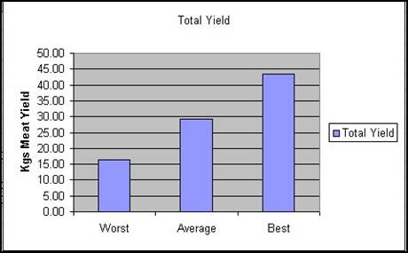 Processors are reporting significant variations in meat yields. Figure 5 represents the Worst, Average and Best meat yields of one processor over a period of 18 months. As can be seen it would take nearly 3 birds with the worst yields to provide the same meat as one of the best birds. The slaughter and processing costs per bird are very similar regardless of meat yield.