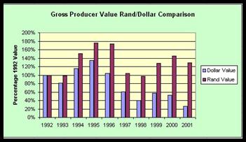 In a competitive product market, there is danger in only watching the correct return of local currency achieved instead of watching the Dollar value. The South African Farmer at the end of 2001 was achieving 130% of the Rand value for a bird in 1992. However, in view of the devaluation of the Rand, as can be seen in figure 7, it was only 20% of the US Dollar value.
