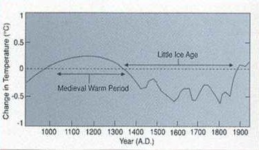 Figure 1 is from a paper published in the Journal Nature in 1998 and authored by 3 scientists. The graph demonstrates that global temperatures had been reasonably constant for a millennium up to the early twentieth century and then risen rapidly, particularly at the end of the century. This graphic was known as the "hockey stick graph' because of the shape.#1 The importance of this graph is that it was used in a UN report to put forward the claim for global warming. Prior to the UN report published in 2001, the existence of a warm period of about 500 years between c.950 and c.1450AD had not been contested or controversial. Figure 2 is the graphic that had previously been used. The hockey stick graph, produced by Mann et al was replaced by the IPCC to make it appear that there had been a dramatic increase in CO2 and temperature in recent years from manmade factors.